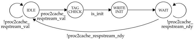 You can see the write init request going into the cache on cycle 4, the cache transitioning through the I -> TC -> IN -> W states, the tag array being updated in the IN state, and the write init resopnse being returned from the cache on cycle 7.