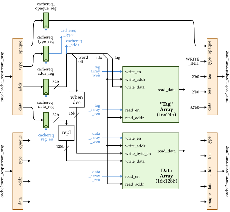The baseline implementation for this lab will be a 256B direct-mapped cache with 16B cache lines and a write-back, write-allocate write policy. In this discussion section, we provide you a simple cache that partially implements the write init transaction. The block diagram for how the datapath unit is shown below.